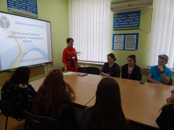 22 травня 2019 року з метою ознайомлення з новими онлайн-ресурсами служби зайнятості для учнів 9 та 10 класу НВК «Спеціалізована загальноосвітня школа І-ІІІ ступенів №1 імені А.С.Малишка» м. Обухова було проведено профінформаційний захід, на якому фахівці з профорієнтації Наталія Дудар та Каріна Сільченкова презентували діагностичний комплекс «Моя професія: консультаційна мережа» та «Платформу з профорієнтації та розвитку кар’єри ДСЗ». Старшокласники ознайомились з можливостями та перевагами даних сервісів. Відтепер система профорієнтаційного діагностування стала загальнодоступною: усі бажаючі мають можливість безкоштовно отримати послуги з профорієнтації дистанційно у он-лайн форматі. Після заходу шестеро бажаючих пройшли тестування в центрі зайнятості та отримали консультації фахівців щодо вибору майбутньої професії.