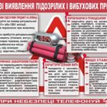 Отримавши повідомлення про закладений вибуховий пристрій, виявленні предметів, що викликають підозру, необхідно негайно поставити до відома чергову службу об’єкта (там, де вона є) і повідомити отриману інформацію до чергової частини органів МВС та ДСНС, при цьому вказати точну адресу та назву організації, де виявлено вибуховий пристрій, номер телефону.