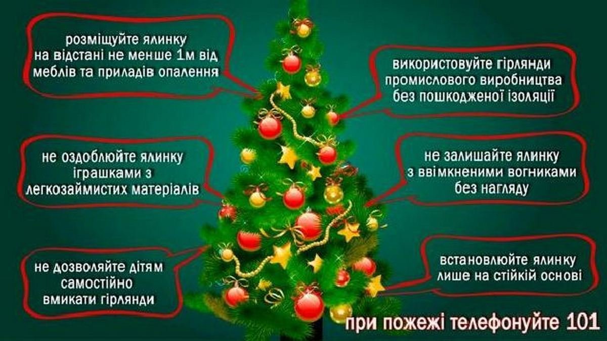 Встановлювати ялинку на надійній, стійкій підставці, подалі від штор, гардин та інших предметів, які легко піддаються вогню. Не ставити її в проходах та біля виходу з помешкання, освітлювати ялинку тільки електричними гірляндами промислового виготовлення.