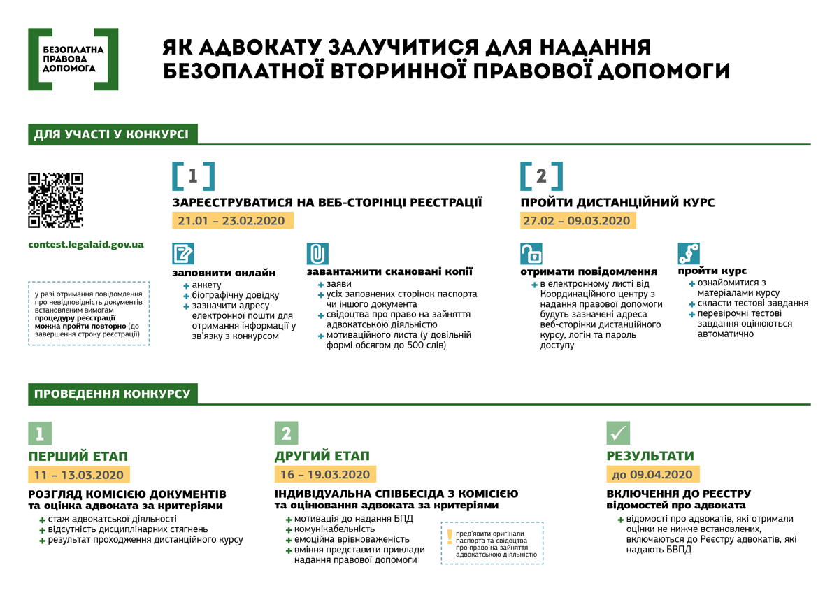 Відповідно до наказу Міністерства юстиції України від 17.01.2020 № 128/7 «Про проведення конкурсу з відбору адвокатів, які залучаються для надання безоплатної вторинної правової допомоги» Координаційний центр з надання правової допомоги повідомляє про проведення з 20 січня по 30 березня 2020 року конкурсу з відбору адвокатів, які залучаються для надання безоплатної вторинної правової допомоги (далі – конкурс).