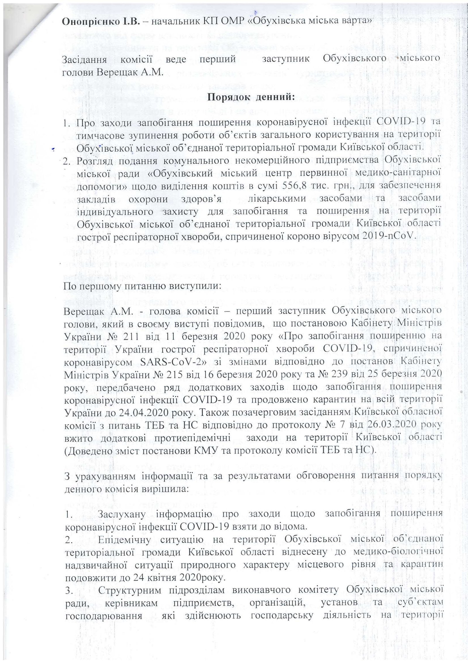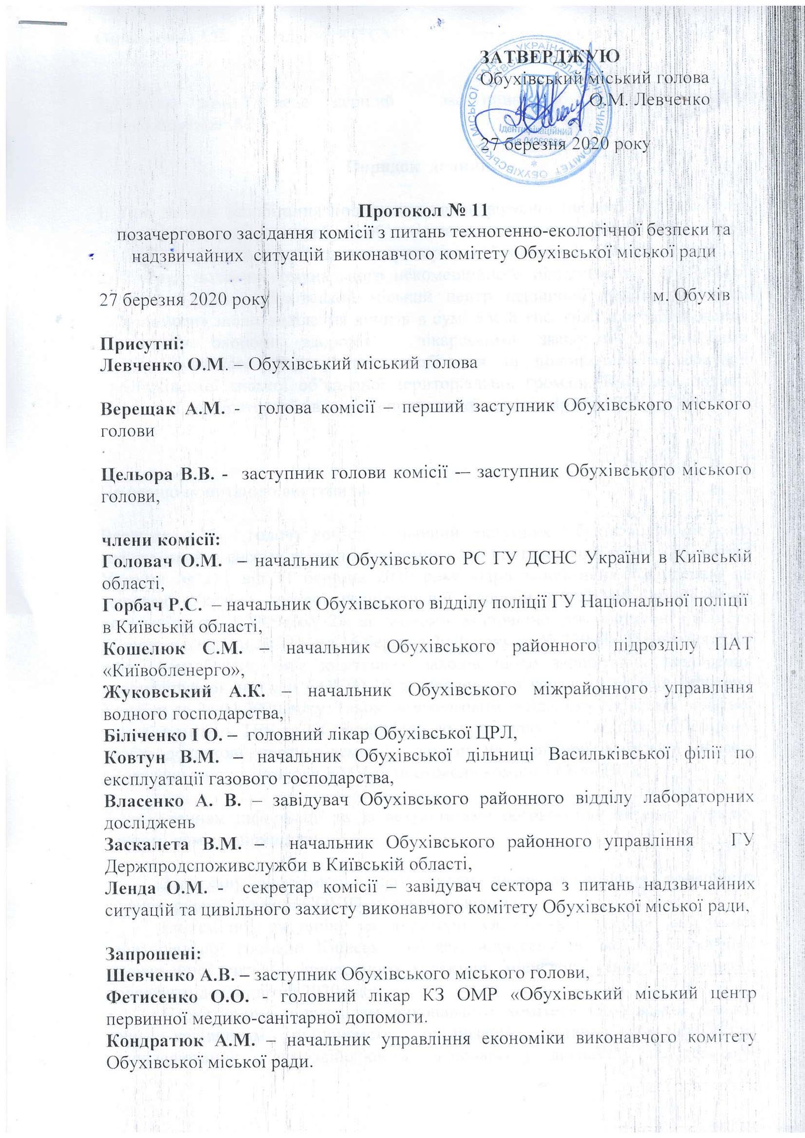 Протокол позачергового засідання з питань техногенно-екологічної безпеки та надзвичайних ситуацій виконавчого комітету Обухівської міської ради від 27.03.2020