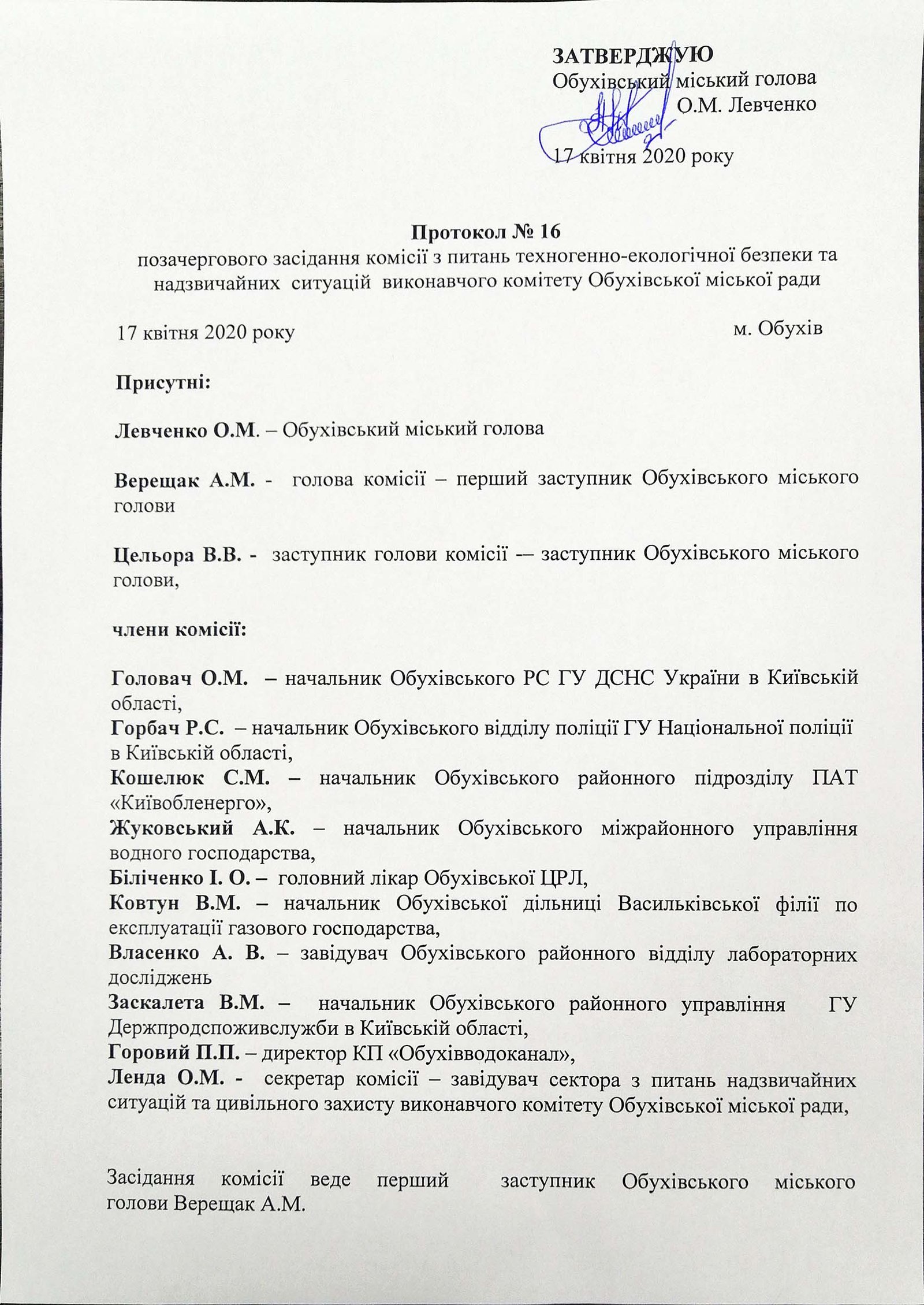 Протокол позачергового засідання з питань техногенно-екологічної безпеки та надзвичайних ситуацій виконавчого комітету Обухівської міської ради від 17.04.2020