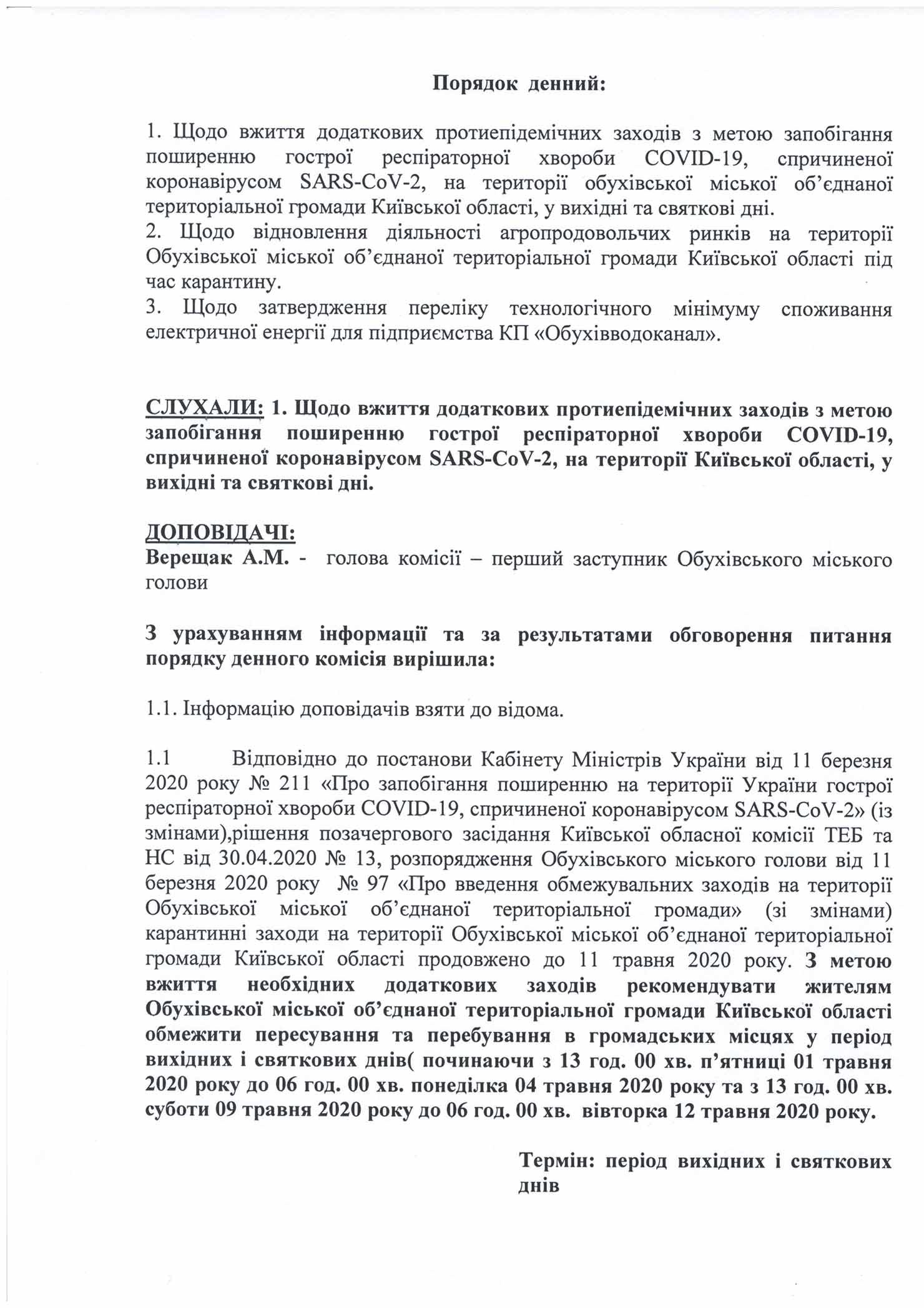 Протокол позачергового засідання з питань техногенно-екологічної безпеки та надзвичайних ситуацій виконавчого комітету Обухівської міської ради від 30.04.2020