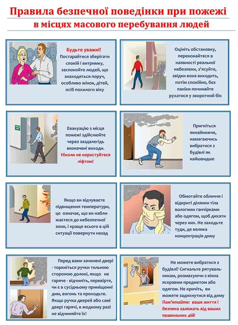 - Необхідно на видному місці розмістити плани евакуації людей на випадок пожежі, а також інструкцію з пожежної безпеки. Інструкція визначає дії персоналу для безпечної та швидкої евакуації людей. Для об’єктів з перебуванням людей уночі інструкція повинна також передбачати дії персоналу у нічний час. Не рідше одного разу на півроку мають проводитися практичні тренування всіх задіяних працівників.
