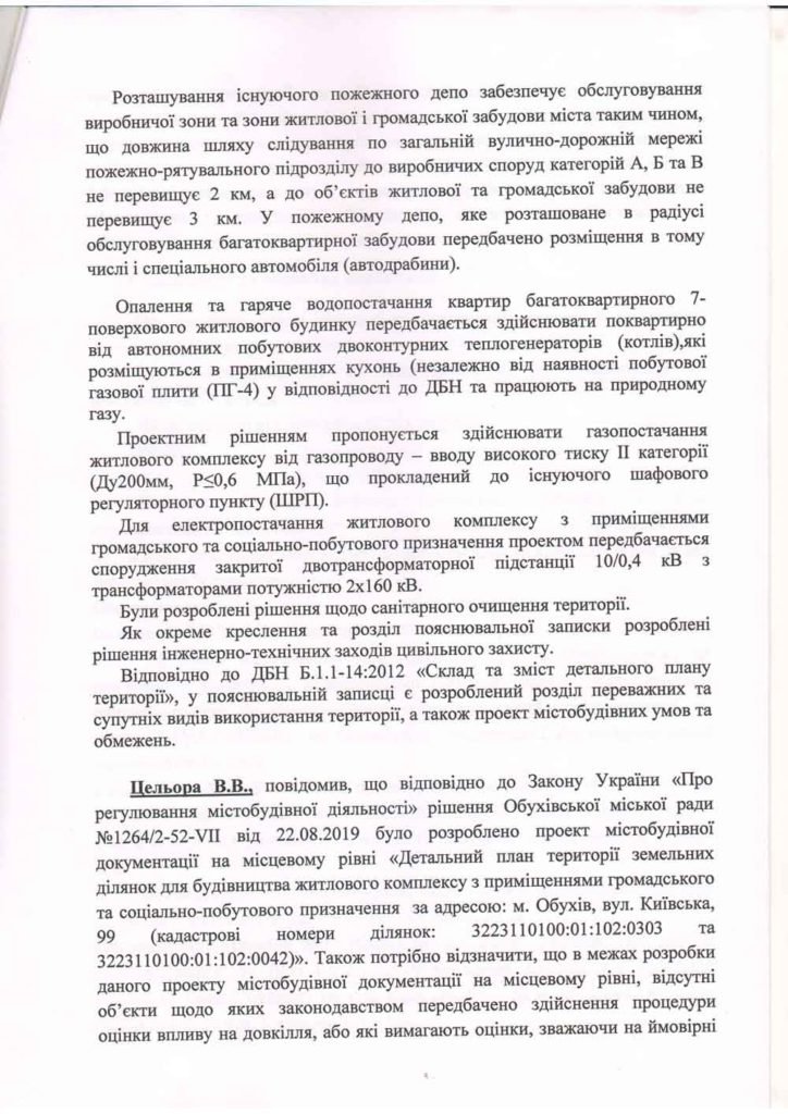 Протокол громадського обговорення (слухань) про розробку детального плану території земельних ділянок для будівництва житлового комплексу з приміщеннями громадського та соціально-побутового призначення за адресою: м. Обухів, вул. Київська, 99 (Кадастрові номери ділянок: 3223110100:01:102:0303,3223110100:01:102:0042)