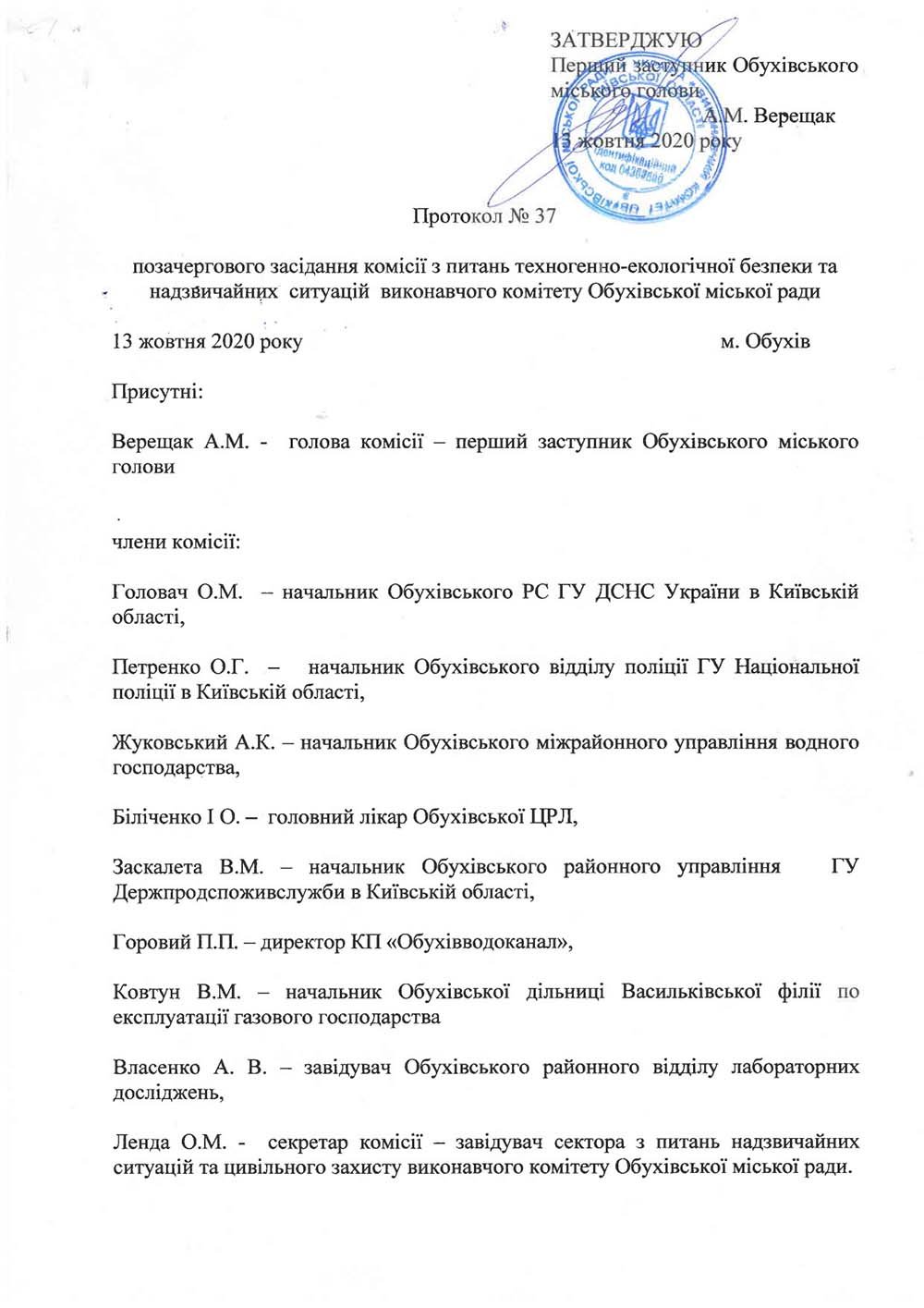 Протокол позачергового засідання з питань техногенно-екологічної безпеки та надзвичайних ситуацій виконавчого комітету Обухівської міської ради від 13.10.2020