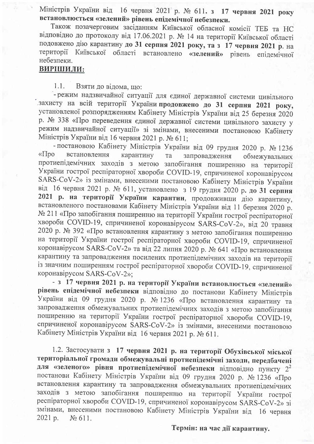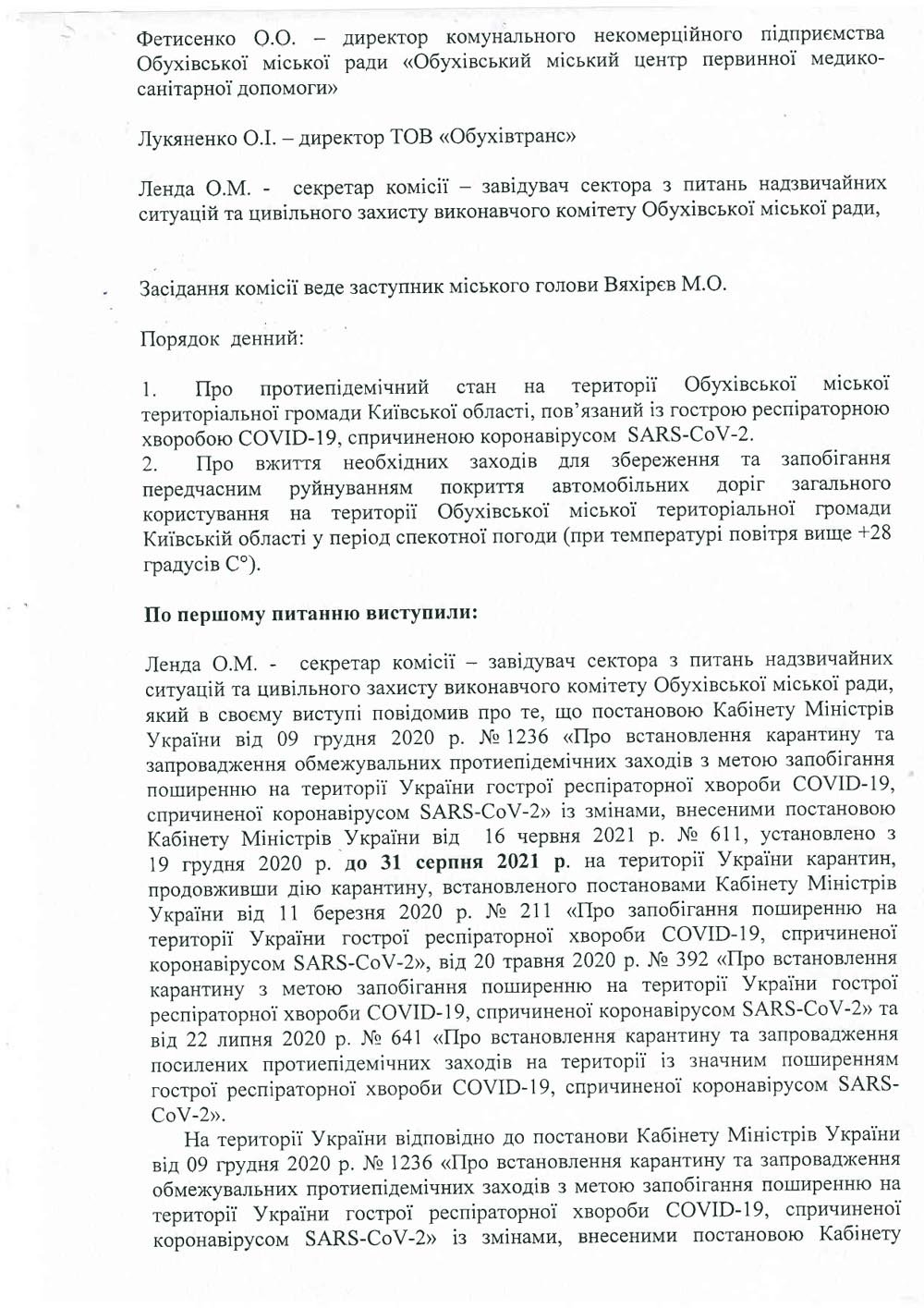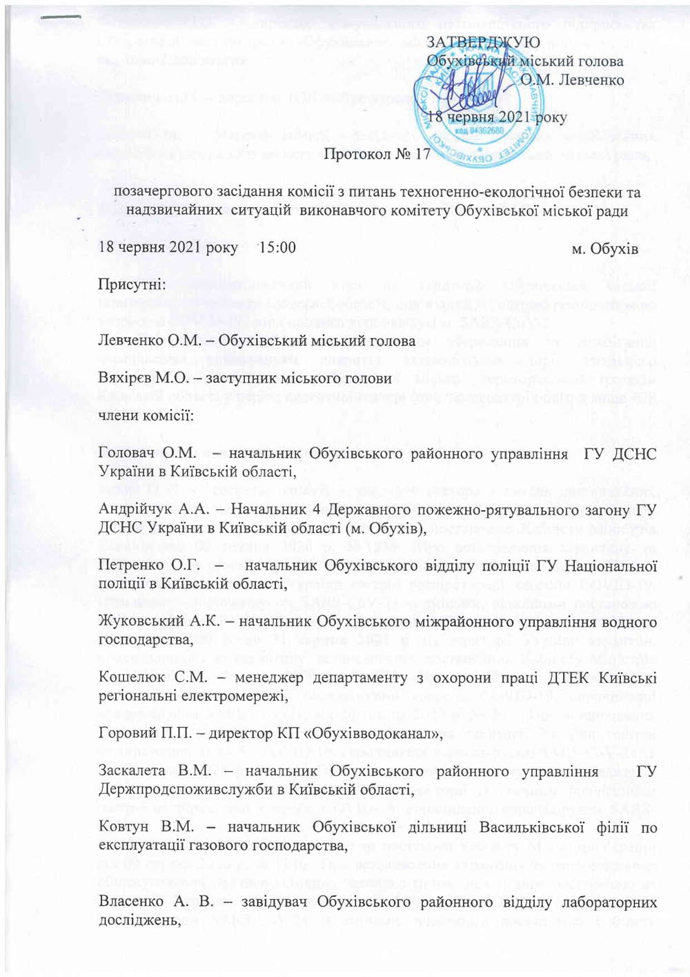 Протокол позачергового засідання з питань техногенно-екологічної безпеки та надзвичайних ситуацій виконавчого комітету Обухівської міської ради від 18.06.2021