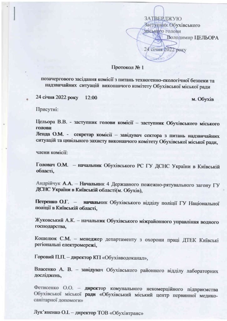 Протокол позачергового засідання комісії з питань техногенно-екологічної безпеки та надзвичайних ситуацій виконавчого комітету Обухівської міської ради від 24.01.2022