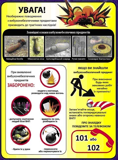 – негайно повідомити про знахідку в місцеві органи виконавчої влади, у ДСНС та в МВС (повідомлення робити не поспішаючи, чітко, із зазначенням точної адреси (орієнтирів) місця знаходження вибухонебезпечного предмета);