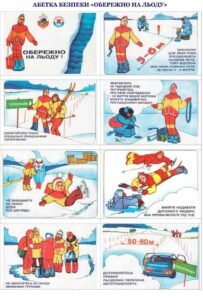 — для одного пішохода – лід синюватого або зеленкуватого відтінку, товщина повинна бути не менше 5-7 см., лід блакитного кольору – найміцніший, білого – міцність у два рази менше, сірий – свідчить про присутність води у товщі льоду;