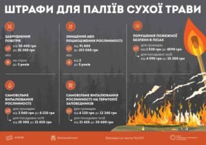 Крім того, відповідно до статті 245 Кримінального Кодексу України, знищення або пошкодження лісових масивів, зелених насаджень навколо населених пунктів, вздовж залізниць, а також стерні, сухих дикоростучих трав, рослинності або її залишків на землях сільськогосподарського призначення вогнем чи іншим загальнонебезпечним способом – караються штрафом від трьохсот до п’ятисот неоподатковуваних мінімумів доходів громадян або обмеженням волі на строк від двох до п’яти років, або позбавленням волі на той самий строк. Ті самі дії, якщо вони спричинили загибель людей, масову загибель тварин або інші тяжкі наслідки, караються позбавленням волі на строк від п’яти до десяти років.