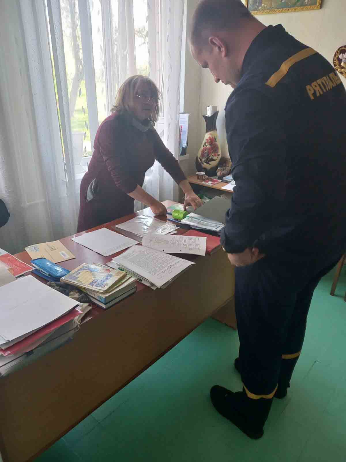 В будівлі гімназії рятувальниками було проаналізовано стан первинних засобів пожежогасіння, комплектацію пожежних щитів протипожежним інвентарем, стан шляхів евакуації з приміщень будівель, стан утримання електрогосподарства, забезпеченість об’єкта протипожежним водопостачанням, а також наявність та працездатність систем протипожежного захисту.