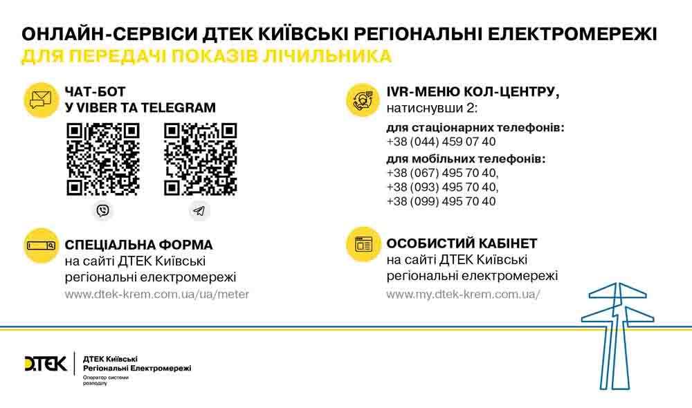 Важливо. ДТЕК рекомендує мешканцям Київщини щомісяця повідомляти покази лічильника, скориставшись дистанційними сервісами. Навіть, якщо клієнт вимушений був тимчасово залишити своє житло, та, відповідно, не використовує електроенергію — обов’язково потрібно дублювати попередній показ. Вчасно передана інформація про спожиту електроенергію дозволяє сформувати точні обсяги споживання за календарний місяць, а компанії-постачальнику — рахунки за спожиту електроенергію.