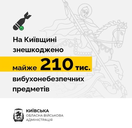 У Київській області під час розмінування відповідними службами вже знешкоджено майже 210 тисяч вибухонебезпечних предметів. Проте на сьогодні ідентифіковано понад 17 тисяч га небезпечної території. Про це заявив начальник Київської ОВА Руслан Кравченко на своїй сторінці у Facebook.