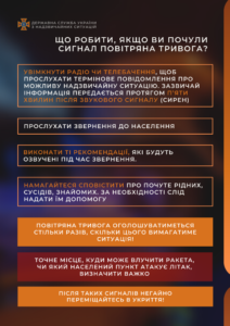 – ні в якому разі не можна після сигналу «Повітряна тривога» залишатися в будинках, особливо на верхніх поверхах;