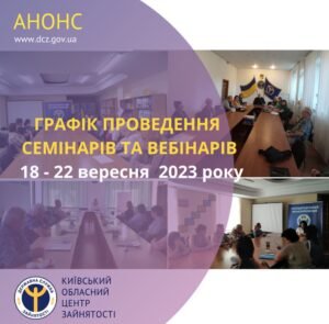 Розклад проведення інформаційних семінарів, тренінгів, вебінарів Київської обласної служби зайнятості на на 18 – 22 вересня 2023 року за посиланням: https://kir.dcz.gov.ua/anonspodiya/informaciyni-seminary-kyyivskoyi-oblasnoyi-sluzhby-zaynyatosti-na-18-22-veresnya-2023