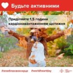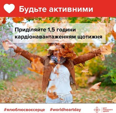 Регулярна фізична активність зменшує ризик серцево-судинних хвороб. За даними ВООЗ для профілактики захворювань серця необхідно займатися фізичною активністю щонайменше 150 хвилин на тиждень. Однак, якщо у вас сидячий спосіб життя, варто рухатися не менше години на день. Для початку намагайтеся щодня гуляти на свіжому повітрі, робити зарядку, менше використовувати ліфт, а підніматися сходами.