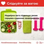 Надмірна вага підвищує ризик серцево-судинних захворювань. Тож, слідкуйте за вагою і харчуйтесь здоровою, збалансованою їжею. Підтримуйте масу тіла у межах ІМТ * 18,5 – 25 завдяки щоденній фізичній активності (*ІМТ — індекс маси тіла = відношення маси тіла у кілограмах до росту у квадратних метрах).