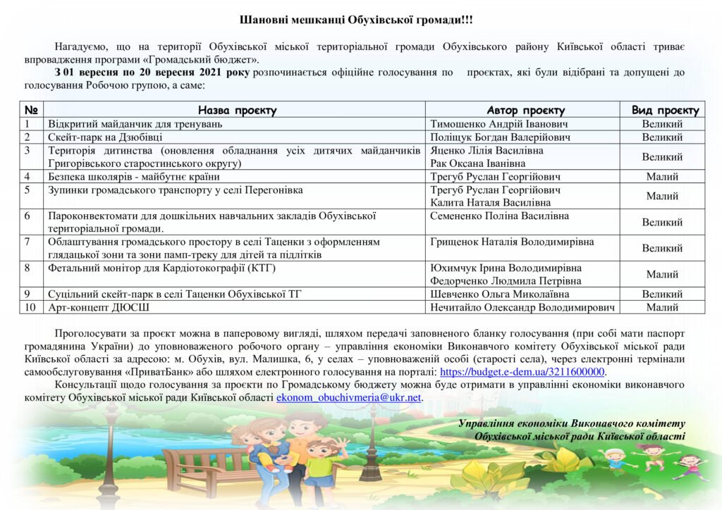 Консультації щодо голосування проектів по Громадському бюджету можна буде отримати в управлінні економіки виконавчого комітету Обухівської міської ради (тел. 045 72 5-02-22).