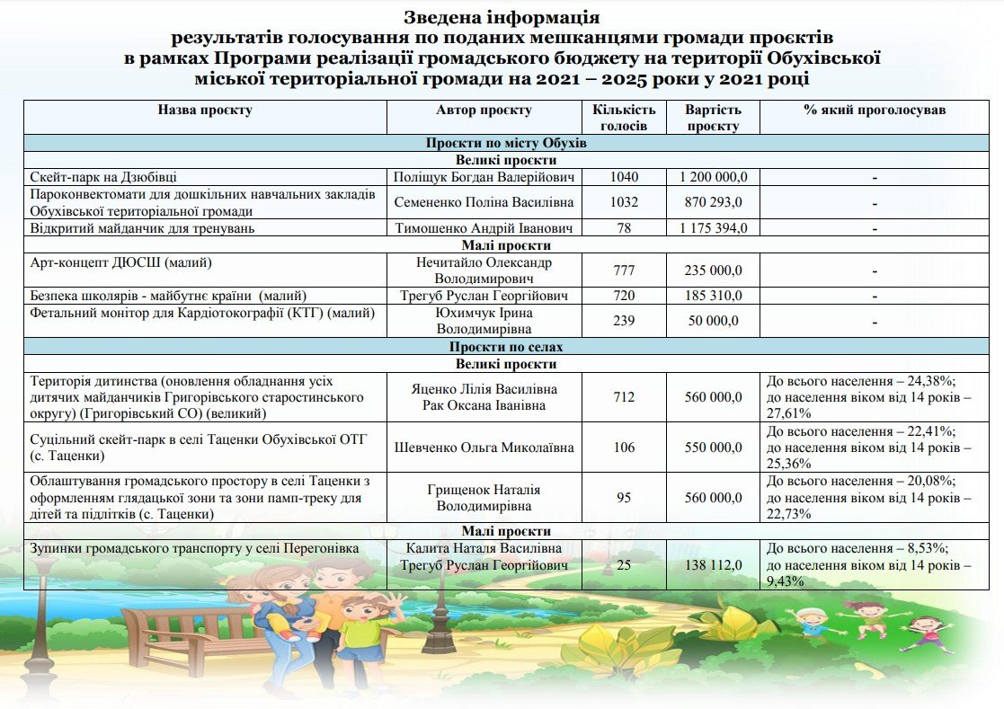 До голосування допущені 3 проєкта: «Пароконвектомати для дошкільних навчальних закладів», «Реабілітаційний центр стерилізації та порятунку безпритульних тварин у м. Обухів», «Сортуй відходи: від чистої школи до прекрасної громади та квітучої країни».