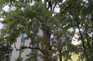 32. Дуб довгожитель. Ботанічна пам’ятка природи – Дуб довгожитель, розташований на Ранковому ринку. Цей дуб природна рештка колишніх дубових лісів, що були поширені на межі Полісся і Лісостепу, йому щонайменше 300 років.